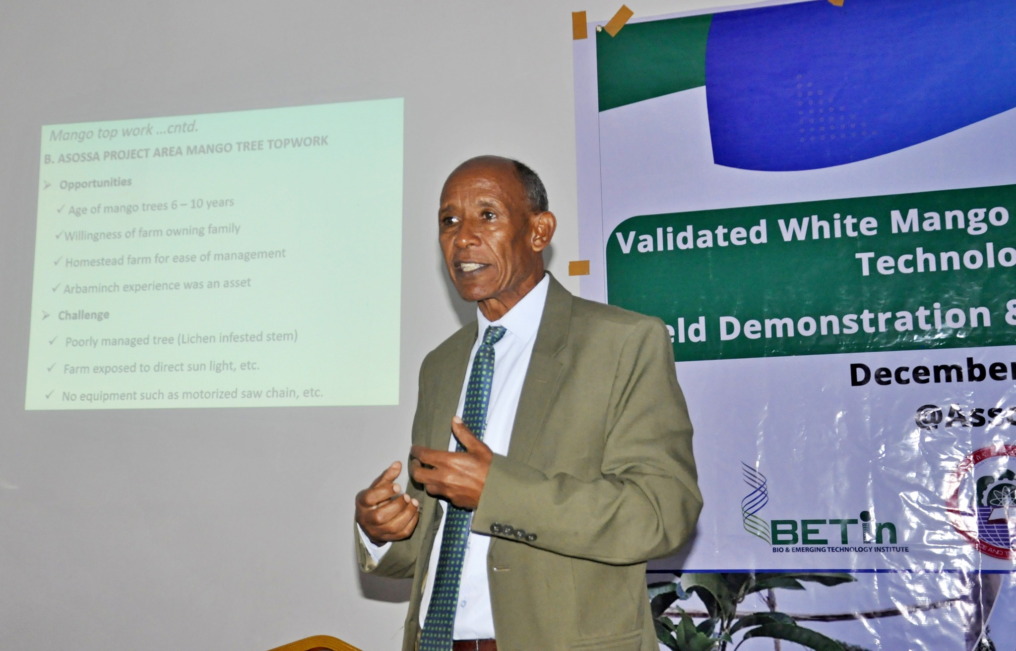 Keynote remarks were delivered by Professor Kassahun Tesfaye, Director General of the Bio and Emerging Technology Institute, who underscored the nutritional and national importance of mango production. He stressed the value of integrated pest management and called for translating research findings into practical solutions for farmers, using the Inzi Shederia site as a training center.