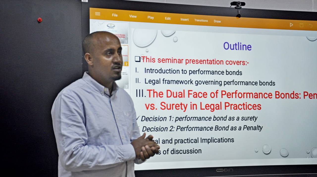 Assosa University School of Law conducted a seminar titled “The Dual Faces of Performance Bonds: Penality Vs Surety in Legal Practice,” presented by Zerhun Yitayew (LLB, LLM).